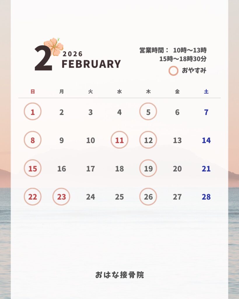 みなさんこんにちは、おはな接骨院です。2026年2月のカレンダーを更新しました!通常通り、木・日・祝日がお休みとなります。皆様のご来院、お待ちしております。 おはな接骨院では、肩こり、腰痛、慢性痛などのお悩みに幅広く対応しています!さらに、疲... -